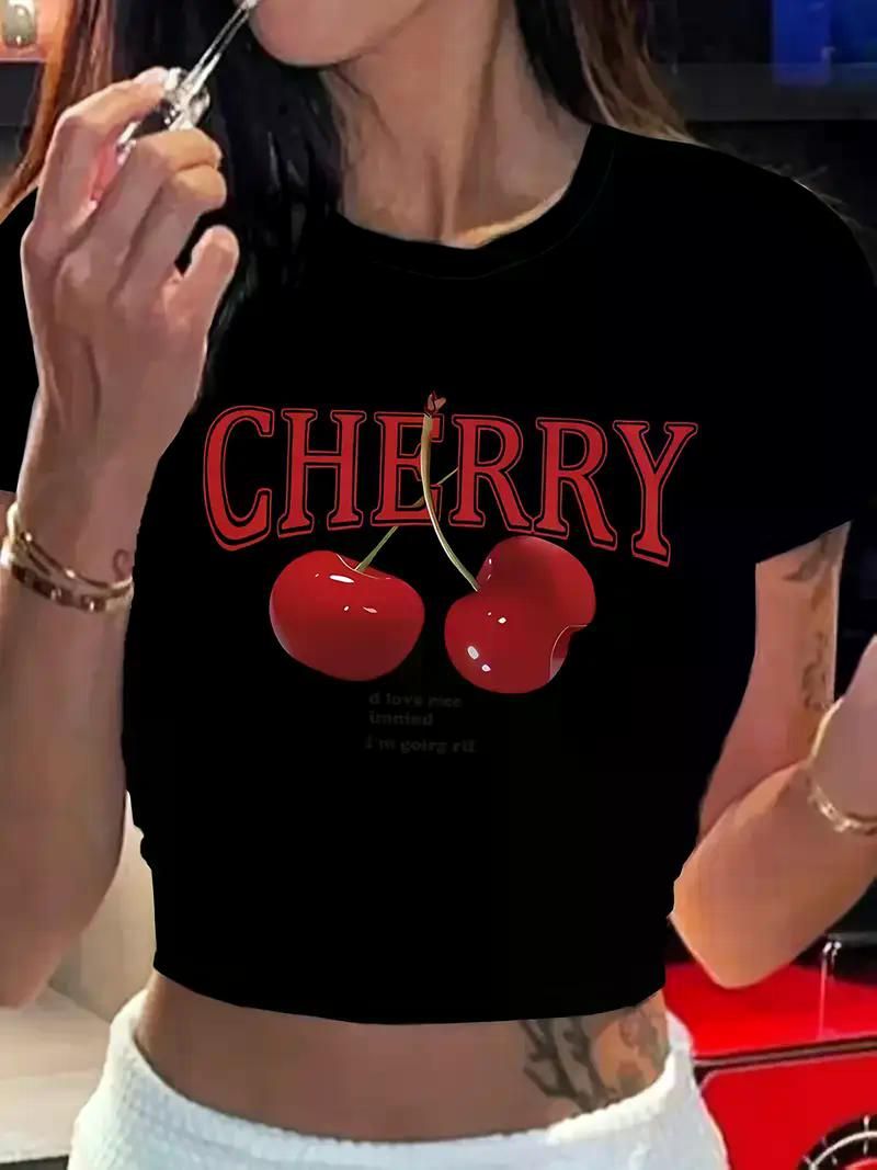 Women's Y2K Inspired Cherry Print Crop Top T-Shirt - Slim Fit, Short Sleeve, Crew Neck,