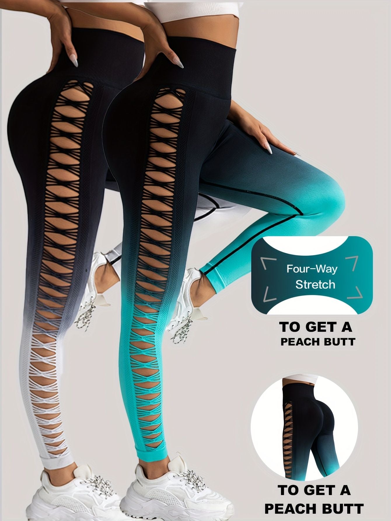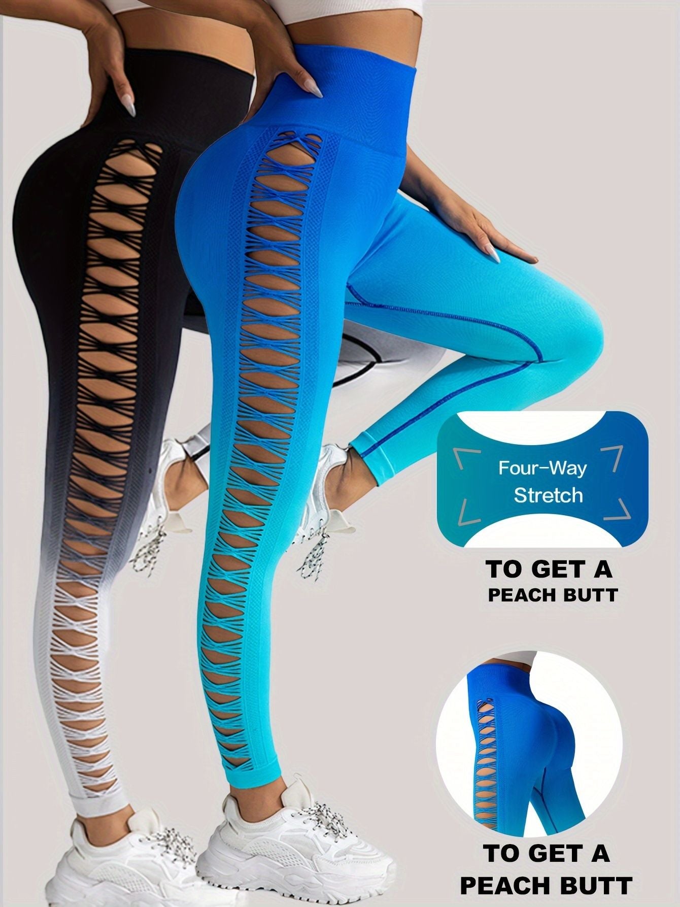 2 Pack Cut Out Ombre Gradient Color Hollow High-waist Butt-lifting Fitness Women's Yoga Pants, Women's High Waist Yoga Pants Cutout Ripped Super Soft And Comfortable Skinny