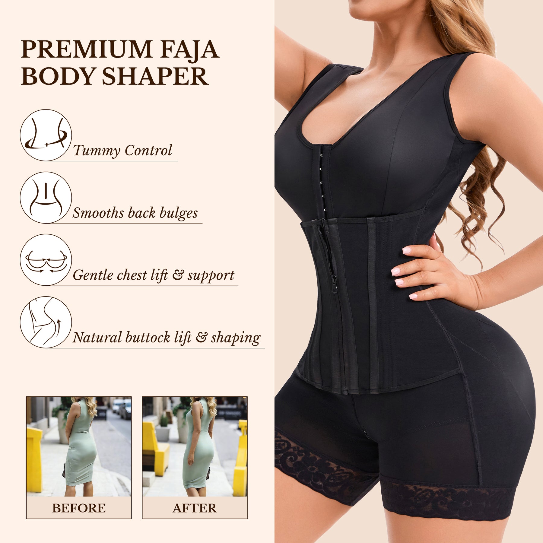 This overbust faja includes a built-in bra that gently lifts and supports your bust, creating a smooth, seamless look. The 3-level adjustable shoulder straps ensure a perfect, customized fit for women of all torso lengths, addressing a common concern for taller customers. The skin-friendly fabric in the buttock area provides a natural butt lifter effect, enhancing your curves comfortably and beautifully.
